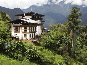 Une maison typiquement bhoutanaise (à droite) avec