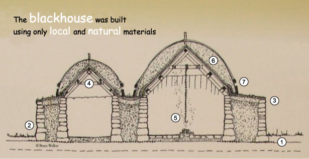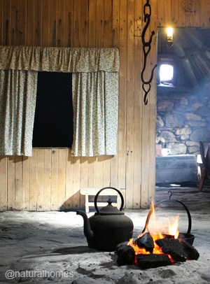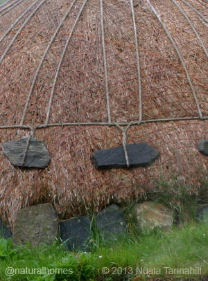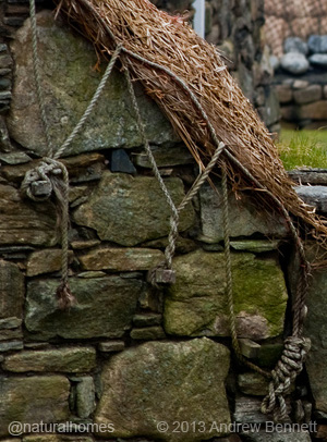 the roof, which is green rather than the warmer thatch. Notice steps are built into the wall leading up to the chimney