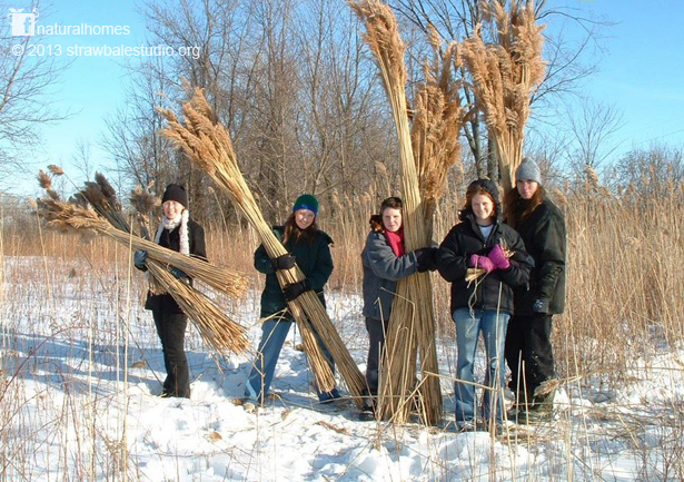 Тростник обыкновенный, высокая многолетняя трава, что растёт в водно-болотных угодьях по всем умеренным и тропическим регионам мира. Он используется для тросниковых крыш и студенты "Студии Соломенных Блоков" собирают его в Оксфорде, Мичиган, США. (на этой фотографии) Вы можете найти эту студию на карте натуральных домов здесь. Это просто чудесно, что ваша крыша просто растет за вашей входной дверью. |