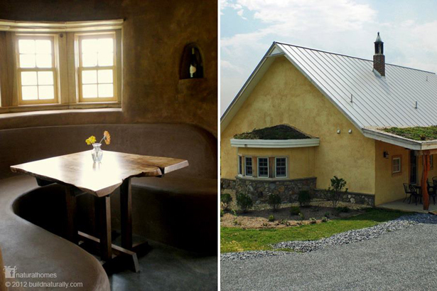 Красота техники коб в том, что вы можете вылепить любую форму. Эта коб скамейка, уютно встроенная в скруглёный эркер, сделана натуральным строителем и архитектором Сиги Коко (Sigi Коко). Это здание из тюков соломы - демонстрационный зал на винограднике Блэк Энкл в Маунт-Эйри, штат Мэриленд, США.